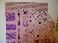 It looks kinda good so I will go with the bottom row. I really want that center medallion, as it were, to be on the top corner still. I thought that it should have the divisions with pink, as I had some of the pink polka dots left, enough to make it look like the purple on the side there. I need to fix that left bottom corner, hmmmm, for some reason I dipped when I sewed it together. I wonder how that happened. Here is what it ended up looking like tonight. It measures 51 x 67 so it is not square and I can sleep tonight.