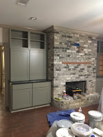 The cabinets are in place beside the fireplace. The ones on the other side are just like these. I will have to take a photo of the whole room when the long arm is moved out of the way.
